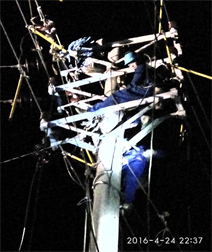 現(xiàn)場(chǎng)負(fù)責(zé)人確認(rèn)所有圍閉、遮攔布置完成,臨時(shí)拉線設(shè)置完成,所有接地線掛接完畢。下達(dá)作業(yè)施工通知,開始進(jìn)行搶修作業(yè)。本次搶修作業(yè)內(nèi)容:更換瓷瓶6組、更換中架空導(dǎo)線3*120導(dǎo)線,由于本次搶修作業(yè)跨公路施工,現(xiàn)場(chǎng)由江門市蓬江局交警協(xié)助進(jìn)行臨時(shí)封路,路邊作業(yè)人員全部穿戴反光衣。(附圖)